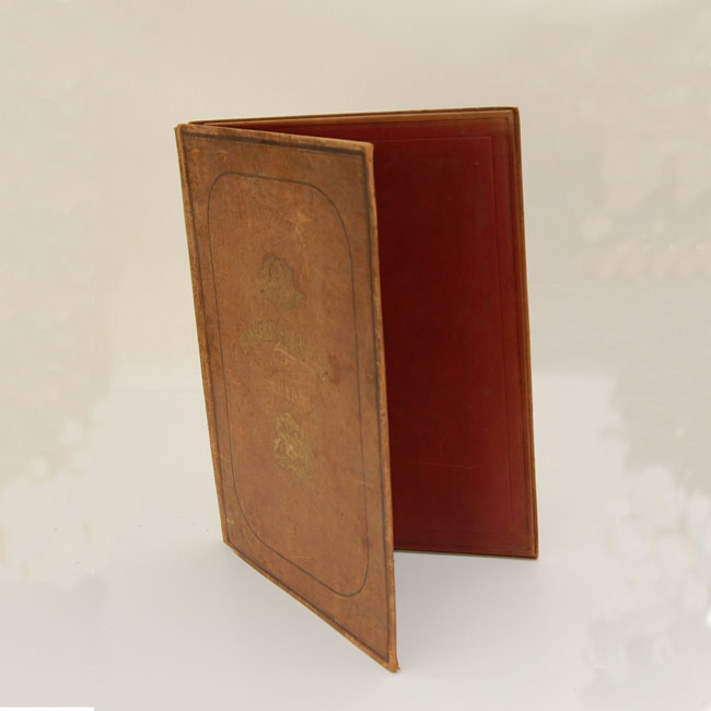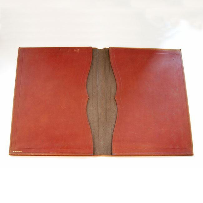Artículo de escritorio usado para guardar documentos. Está formado por dos bolsillos planos unidos entre sí, los que se pliegan como un cuadernillo. En la cara anterior tiene un grabado en dorado, compuesto por una alegoría formada por un cañón, un ancla y una estrella de cinco puntas, todo orlado de laurel; una inscripción y la imagen de un escudo nacional de Chile.