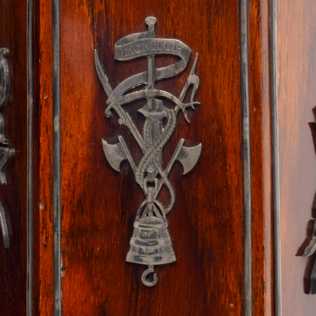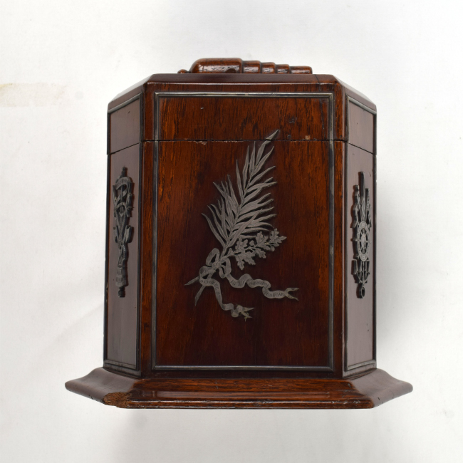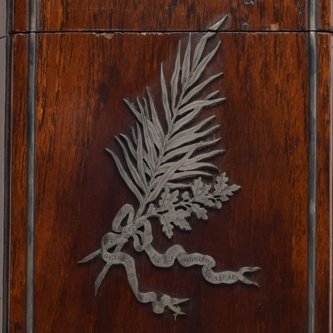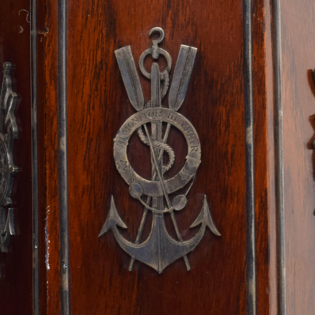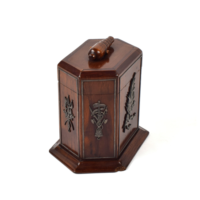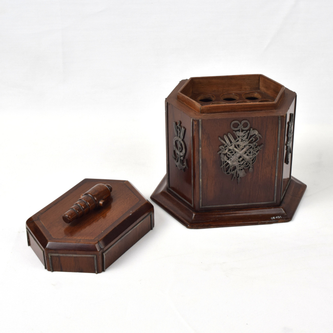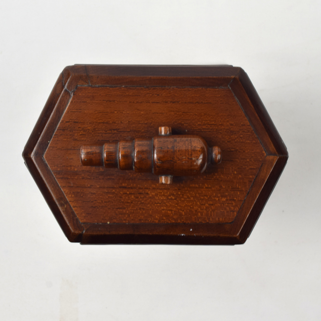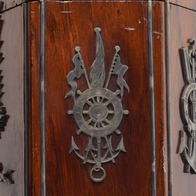 Este objeto forma parte de una serie de souvenirs realizados con madera del blindado peruano Huáscar, capturado en el combate naval de Angamos, durante la guerra del Pacífico.