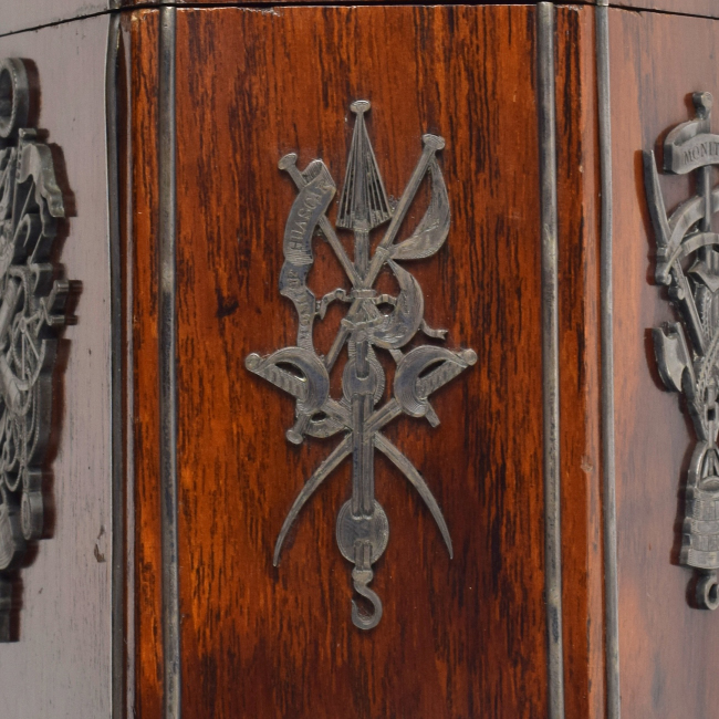 El cuerpo está decorado con seis alegorías -una en cada cara- hechas con una chapa de plata recortada y grabada mediante burilado; las alegorías están formadas por una serie de elementos asociados a la guerra naval y a la náutica, con cintas alusivas al blindado Huáscar y a la batalla del 8 de octubre de 1879. Cada cara está decorada por un borde hecho en plata.