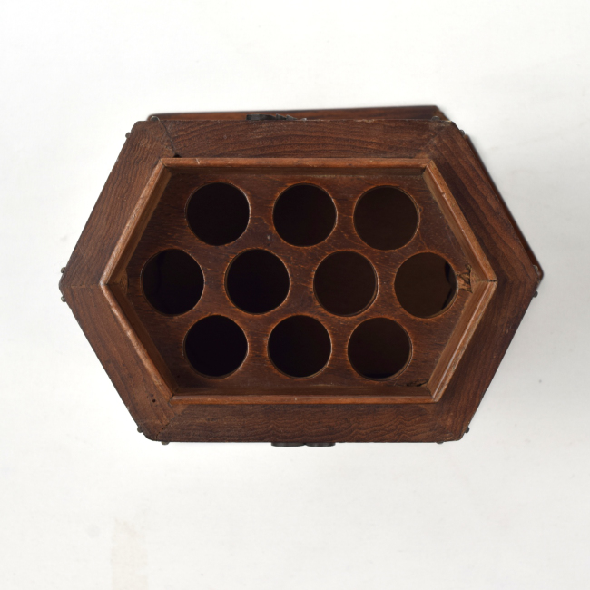 Contenedor de madera usado para guardar puros, compuesto por caja, tapa y base. La caja tiene la forma de un prisma de base hexagonal con una tapa, también hexagonal, y una base que sobresale en todo su perímetro.