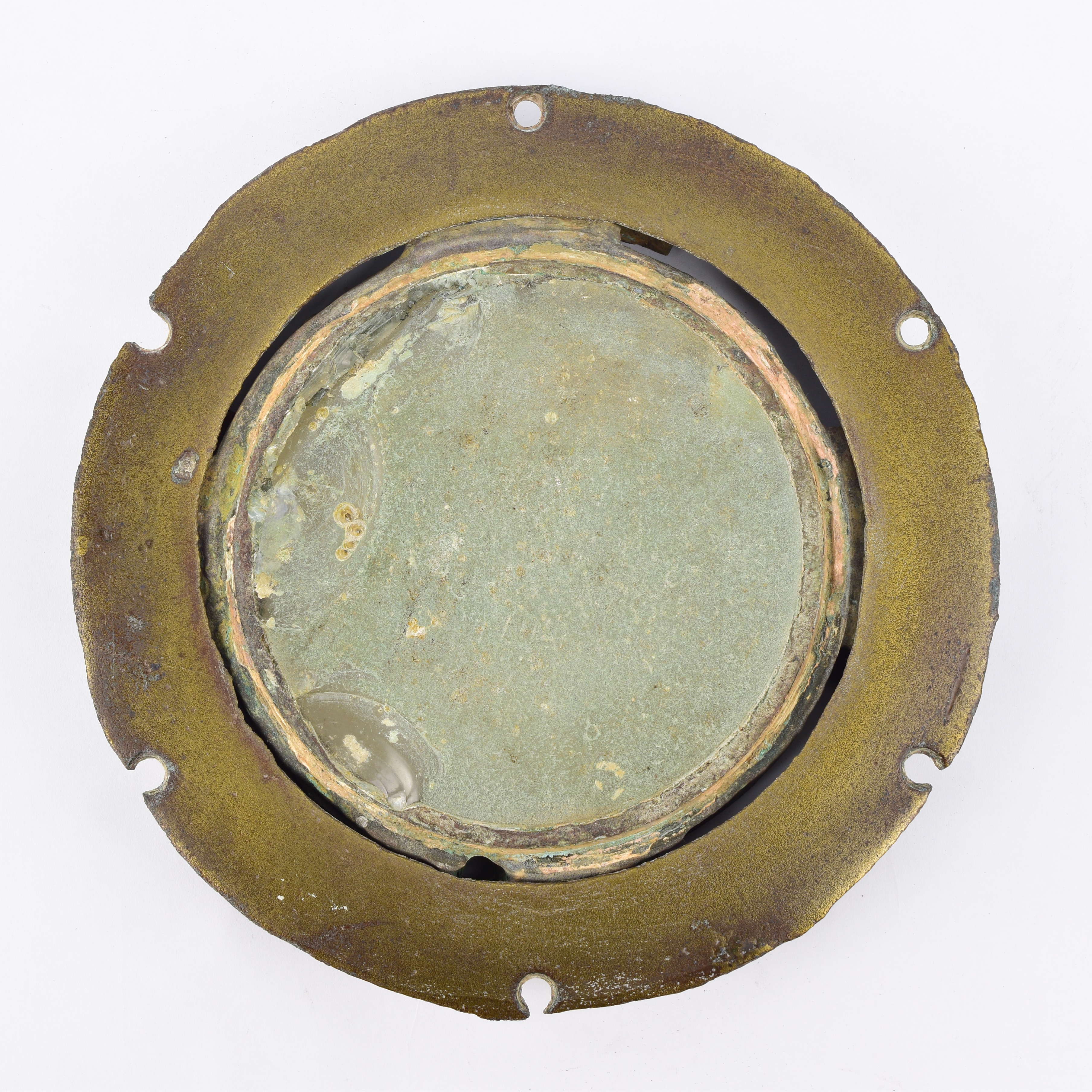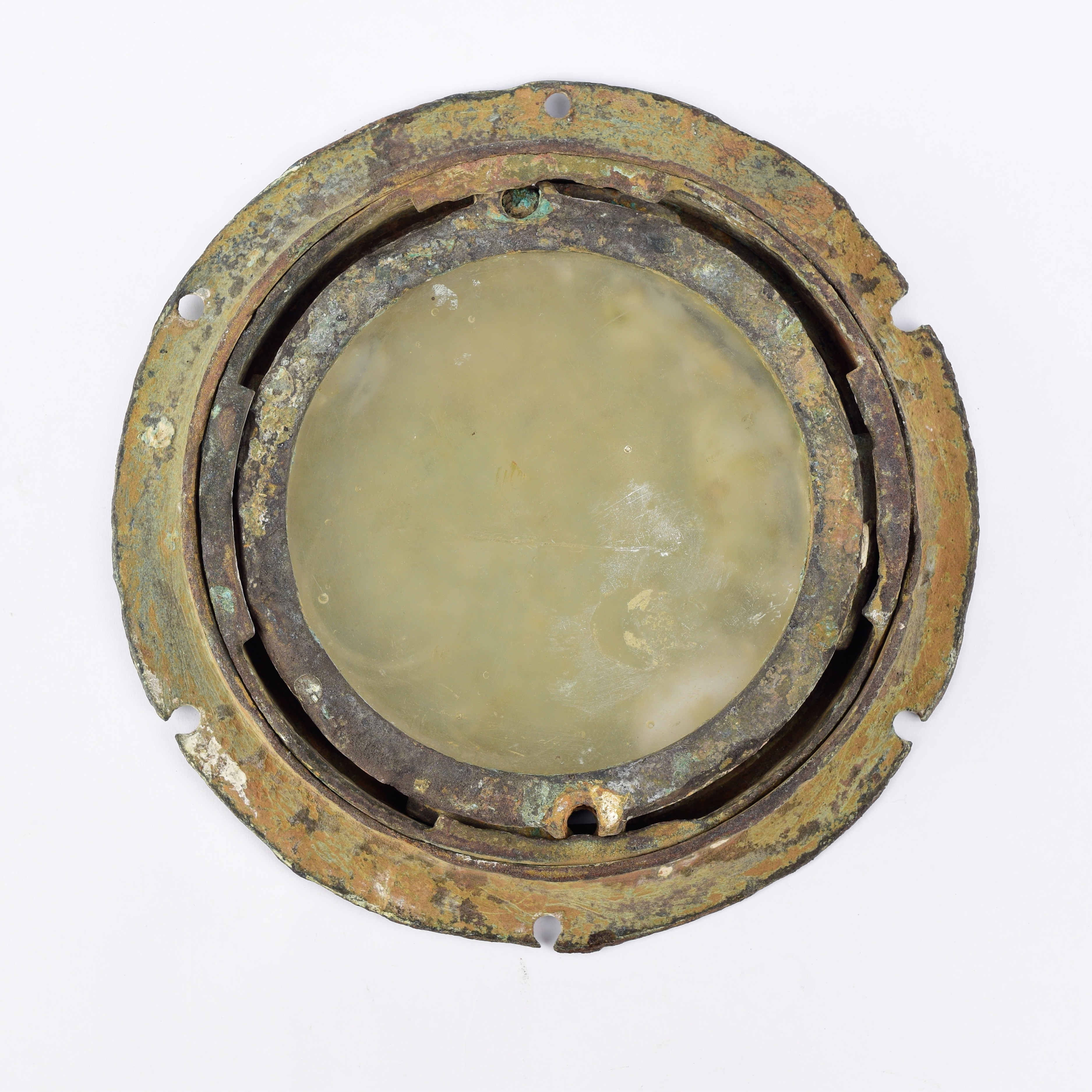 Objeto usado como ventana en una embarcación. Está compuesto por un marco circular de bronce con seis perforaciones usadas para colocar torillos y fijarlo a una estructura vertical, probablemente de madera. El marco aloja una ventana circular con un aro de bronce en todo el perímetro, el que tiene aletas que se insertan en el marco para cerrar la ventana por medio de un cuarto de vuelta o sistema de bayoneta. La ventana tiene dos perforaciones que presumiblemente alojaba una manilla de metal para girar la ventana y retirarla cuando se requiere ventilar un espacio interior.