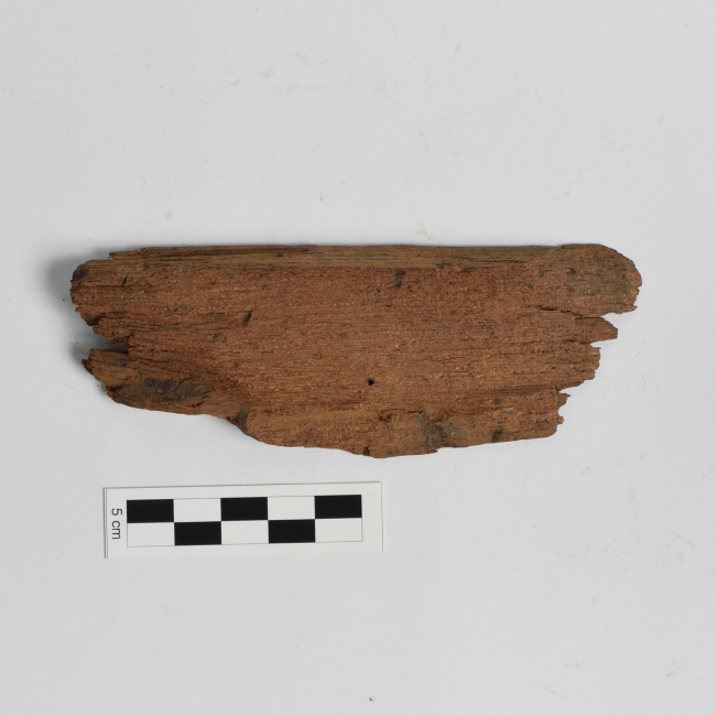Fragmento proveniente del forro interior de madera de la torre de mando del blindado peruano Huáscar, obtenido de entre los fragmentos resultantes producto de la explosión de una granada disparada contra ese buque en el contexto de la batalla naval de Angamos, el 8 de octubre de 1879.