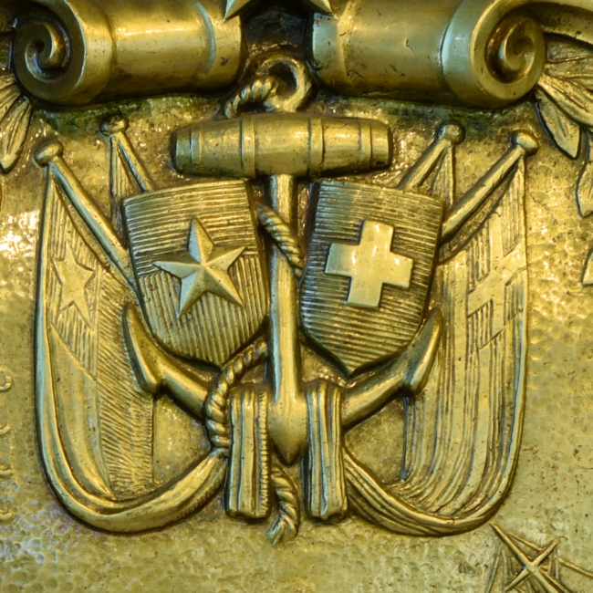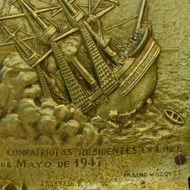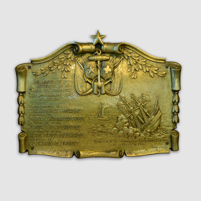 Esta placa fue instalada por la colectividad griega residente en Valparaíso e instalada en el Monumento a la Marina Nacional en Valparaíso. Tras su remodelación en 1978, esta placa fue trasladada al entonces Museo Naval.