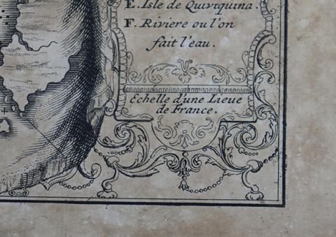 Documento de formato horizontal, monocromo, papel delgado, encuadrado perimetral. Cartografía de la bahía del puerto de Concepción, inscrito dentro de una tela, tipo cortina que contiene dicho plano. Título y leyenda en el costado derecho, circunscrito dentro de un dibujo ornamental. Rosa de los vientos al centro de la bahía.