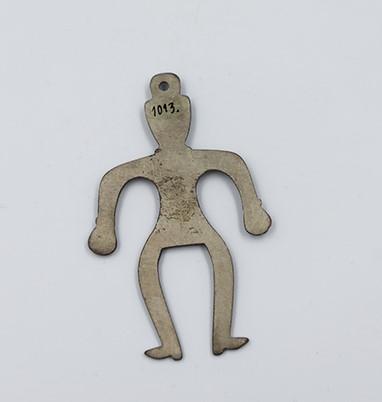 Figura metálica de tonalidad dorada, tiene un diseño antropomorfo y una forma que representa a un individuo masculino, cuenta con un pequeño agujero en la parte superior de la cabeza de la pieza.