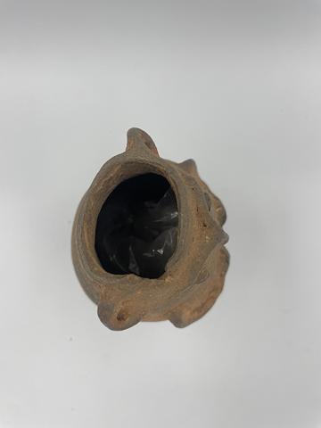 Jarro de perfil complejo y forma asimétrica. Restringido en el cuello. Cuerpo esférico, cuello cónico, borde invertido, labio recto, base plana. Contenedor antropomorfo sin asas. Color marrón rojizo.