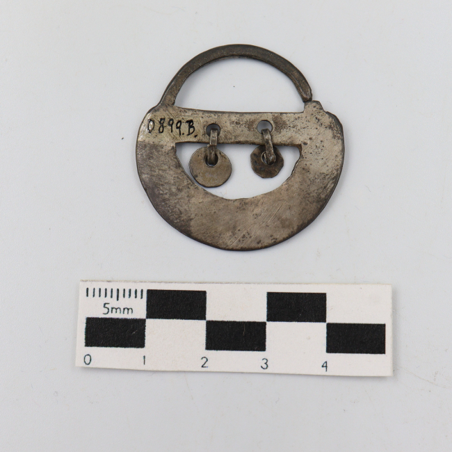 Adornos de plata de uso personal femenino correspondientes a la cultura Mapuche. Estas joyas se utilizan en las perforaciones de los lóbulos de las orejas. Son de forma discoidal y están compuestas por una placa y un gancho. La placa es de forma semicircular y tiene un calado semicircular en su interior. En la parte superior de la placa se observa un gancho curvo y plano que va en el lóbulo de la oreja.Presentan dos colgantes discoidales los cuales se ubican en el sector superior , arriba del calado. Estos colgantes están unidos a la placa mediante una argolla circular. Tienen una decoración en la parte inferior al calado, la cual consiste en una secuencia de líneas semicirculares con círculos en su interior, esta decoración fue realizada con cuño.
