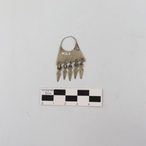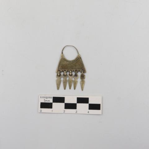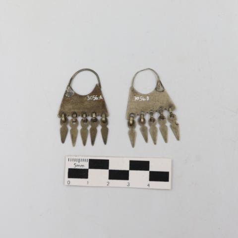 Adornos de plata de uso personal femenino correspondientes a la cultura Mapuche. Estas joyas se utilizan en las perforaciones de los lóbulos de las orejas. Están compuestos de una placa trapezoidal y un gancho. El gancho es delgado delgado y se ubica en la parte superior de la placa, este va en el lóbulo de la oreja. En la zona inferior de la placa se observan 5 secciones semicirculares perforadas, en cada sección va una argolla ovalada la cual une 5 colgantes al aro. Los colgantes son planos, tienen forma circular en el extremo superior y en el inferior tienen forma triangular alargada. La decoración de la placa consiste en líneas rectas que delimitan la forma trapezoidal. Dentro de la sección delimitada por las líneas rectas se observan líneas punteadas ubicadas a la derecha, izquierda y abajo y una linea ondulada en la parte superior.