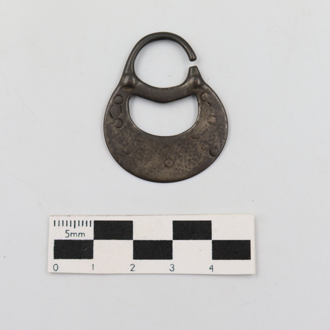 Adornos de plata de uso personal femenino correspondientes a la cultura Mapuche. Estas joyas se utilizan en las perforaciones de los lóbulos de las orejas. Son de forma discoidal y están compuestas por una placa y un gancho. La placa es de forma semicircular, con un calado interior en forma de medialuna. Tiene un gancho curvo y grueso en el sector superior el cual va en el lóbulo de la oreja. La decoración consiste en dos protuberancias semiesféricas ubicadas en el sector superior de la placa por el anverso y dos protuberancias iguales ubicadas en el reverso de la placa. En el sector del anverso se observa una decoración circular realizada con cuño.