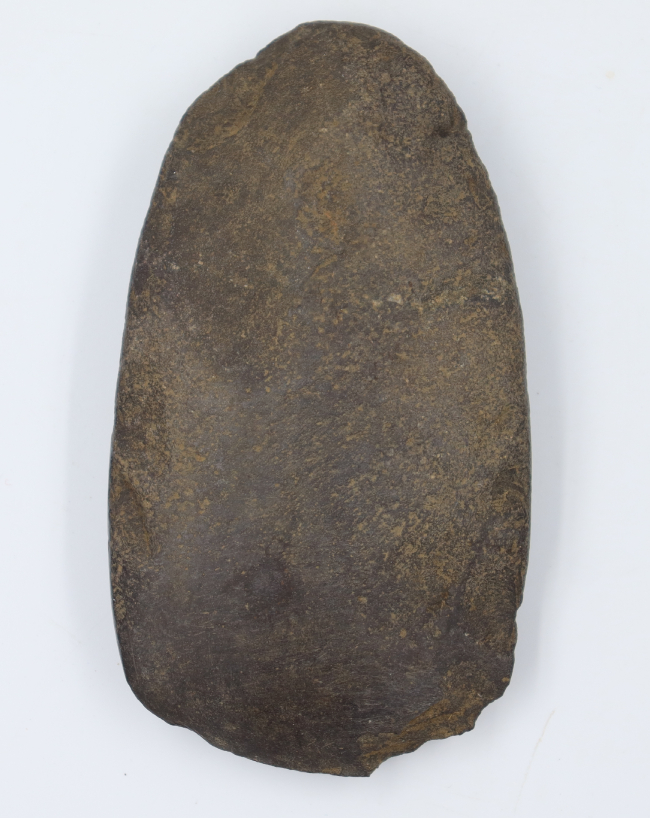 Hacha lítica. La forma general del hacha es trapezoidal de sección oblonga. El extremo superior tiene bordes redondeados y el extremo inferior tiene un filo convexo. En extremo distal del filo, presenta dos lascados.