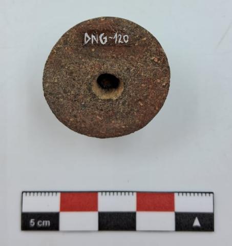 Tortera lítica de forma general troncocónica y base plana. Los bordes son redondeados y rectos y el extremo superior plano. Presenta una horadación circular de 0.6 cm de ancho. Tiene pigmento rojo adherido en uno de sus lados y un trozo de madera cilíndrico en la horadación, el cual es un remanente del vástago de la tortera.