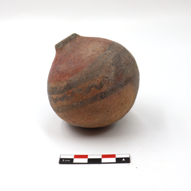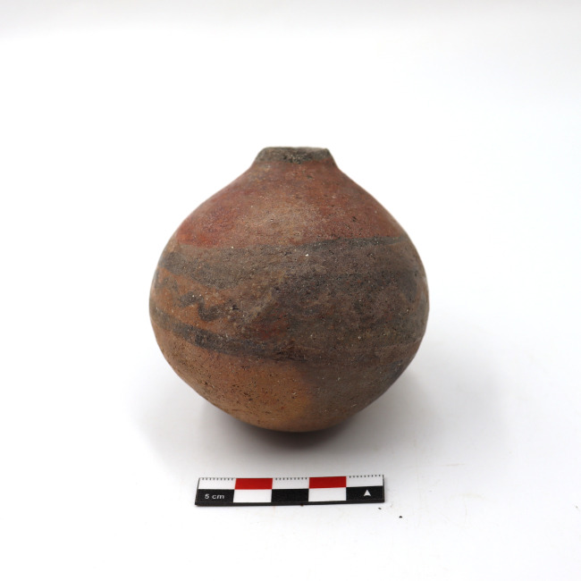 Contenedor cerámico restringido simple. Su forma general es ovoide apuntada. Presenta un cuello de baja altura con bordes directos y labio redondeado, la base es apuntada. La decoración se compone por engobe rojo al rededor del cuello y una banda anular linealmente delimitada con una linea ondulada en el centro en la zona medial. La base y zona medial no presentan decoración pero si tratamiento de superficie alisado. En el borde se observa una banda negra. Se observa un punto de calor.