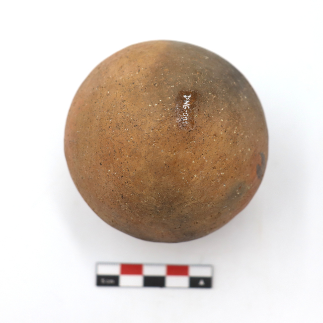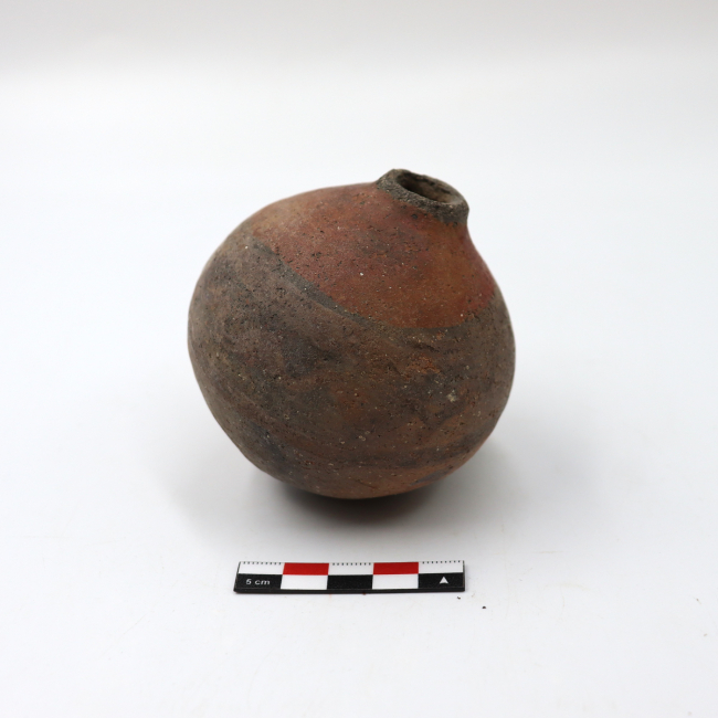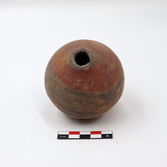 Los mates cerámicos de Arica corresponden a una forma cerámica recurrente dentro de la tradición alfarera de los Valles Occidentales, definida por Uribe (1999) como vasijas restringidas de cuerpo globular u ovoide de base apuntada. Tecnológicamente, se elaboran mediante modelado y ahuecamiento, con cocciones mayoritariamente oxidantes y superficies alisadas o pulidas. Esta vasija en particular fue adscrita al estilo Pocoma-Gentilar considerando su superficie sin pintar anaranjada dentro del diseño.