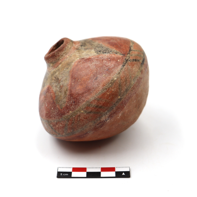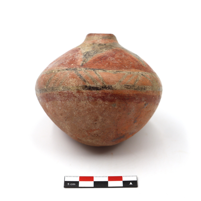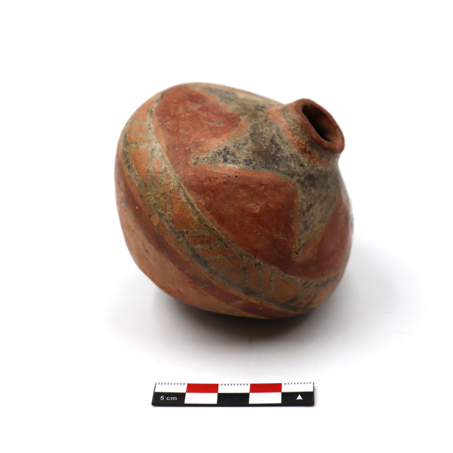 Contenedor restringido. Su forma general es elipsoidal horizontal. Presenta un cuello compuesto por bordes invertidos de labio plano y una base apuntada. La decoración se concentra en la mitad superior de la pieza y consiste en una una línea de pintura negra cerca del cuello, luego una banda sinuosa en zig-zag de lineas paralelas con pintura negra la cual vista desde una perspectiva polar sugiere una decoración estrellada de 5 puntas. Luego se observa una banda anular en pintura negra la cual contienene lineas diagonales en su interior y por último una banda de engobe rojo. La mitad superior de la pieza está decorada con engobe rojo y el resto con engobe anaranjado.