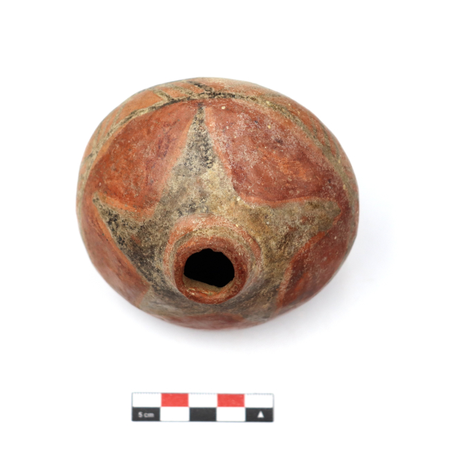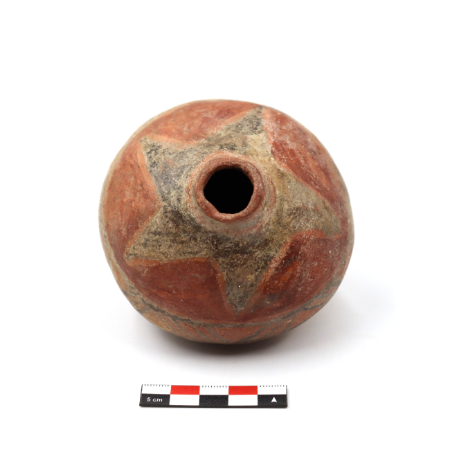 Los mates cerámicos de Arica corresponden a una forma cerámica recurrente dentro de la tradición alfarera de los Valles Occidentales, definida por Uribe (1999) como vasijas restringidas de cuerpo globular u ovoide de base apuntada. Tecnológicamente, se elaboran mediante modelado y ahuecamiento, con cocciones mayoritariamente oxidantes y superficies alisadas o pulidas. Esta vasija corresponde al estilo Pocoma-Gentilar por su decoración estrellada.