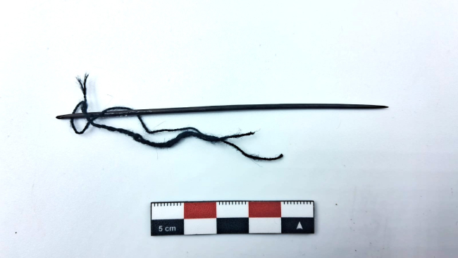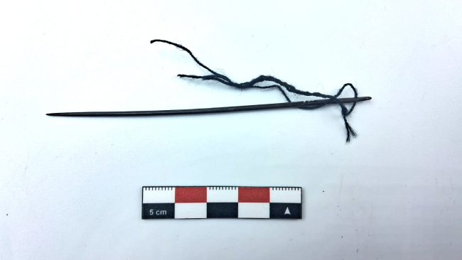 Instrumento utilizado para coser de forma manual. La parte proximal está perforada y tiene una fibra enebrada con torsión en "s". El cuerpo es de sección circular y tubular y el extremo distal es apuntado. Este instrumento está confeccionado en base a una espina de cáctus.