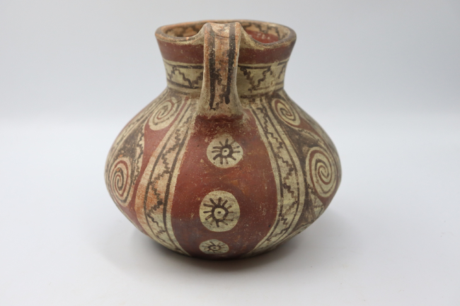 Contenedor cerámico modelado y pulido estilo o fase San Miguel. Posee un cuello cónico invertido, y un cuerpo elipsoidal horizontal, con base plana. Posee un asa tipo correa, que sobrepasa la altura máxima del labio, uniéndole con la parte superior del cuerpo. En cuanto a la decoración, cuenta con la adición de pinturas rojas y cremas para fondos, sobre los cuales se dibujan: franjas de escalinatas geométricas sobre cuello, asa y límites de paneles decorativos en cuerpo, en negro sobre crema (motivo a) tanto en horizontal como vertical, motivos de olas complementarias en negro y rojo sobre crema, entre los que se dibuja en ocasiones (motivo b), escalinatas presentes en la pieza. Así también cuenta con emblemas con motivos solares, con pequeños puntos en medio, todo ello en negro sobre crema. Las escalinastas son dibujadas también en el borde interno de la pieza.