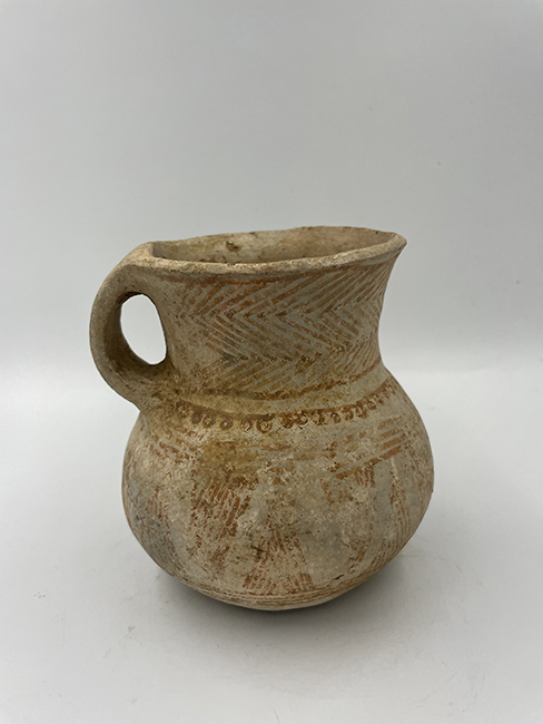 Jarro bicromo decorado. De base convexa y asa plana. Cuerpo engobado de blanco en cual posee diseños lineales y geométricos de color rojizo