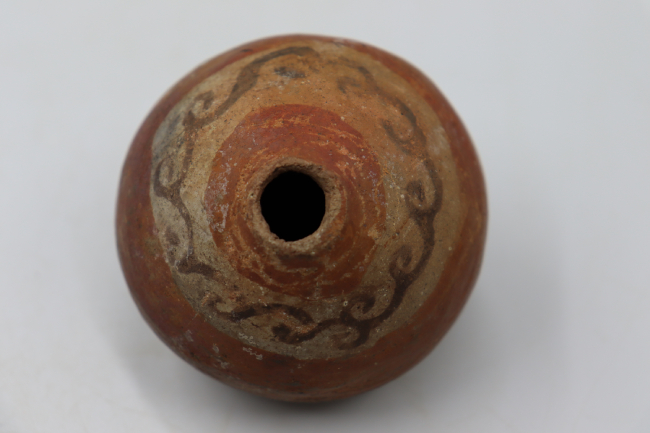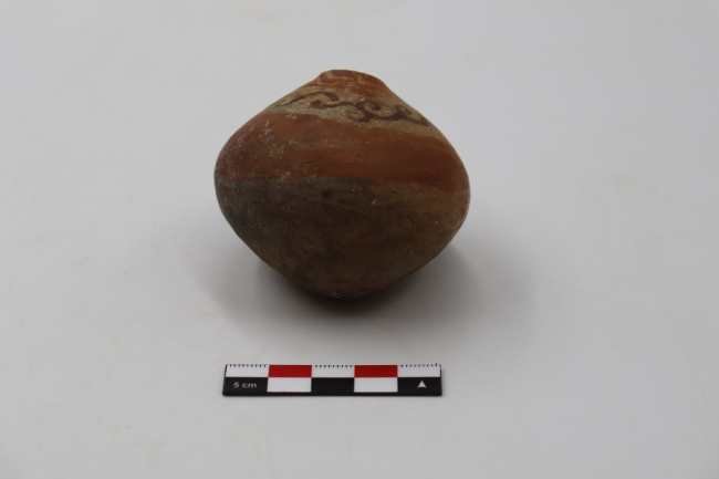 Contenedor cerámico modelado con decorado que se asocia a la tradición alfarera San Miguel. Cuenta con un cuerpo elipsoidal horizontal y base troncocónica invertida, cuenta con un borde que tiende hacia lo hiperboloide, debido a un punto de inflexión que se genera con anterioridad en la sección superior del cuerpo. En cuanto a la decoración, cuenta con dos bandas rojizas, que decoran el borde y la sección media del cuerpo con bandas rojas a modo de anillo, en los que no se percibe una regularidad geométrica en su trazado. Entremedio de éstas dos bandas dispuestas horizontalmente, se aprecia un motivo de olas sucesivas en negro sobre el fondo del ceramio (motivo b).