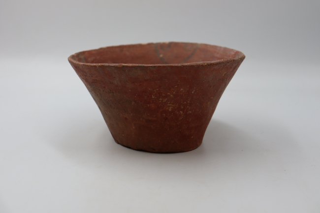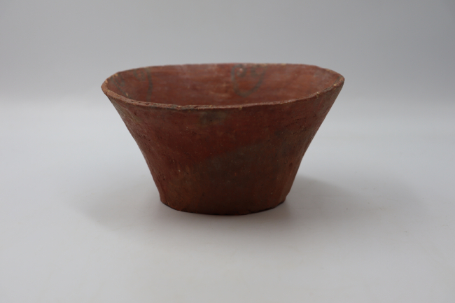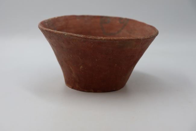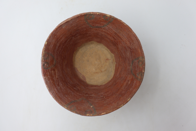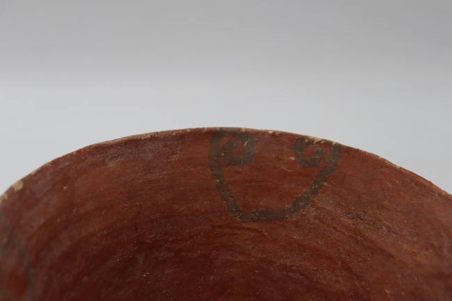 Vasija cerámica modelada y pulida de la Fase o Estilo Cabuza. Cuenta con un borde directo, cuerpo troncocónico invertido y base plana. En cuanto a la decoración, cuenta con un motivo de arcos invertidos en negro que emergen desde el labio interno, con espirales en sus puntos extremos (motivo a), repetidos en 4 ocasiones en torno al radio del labio.