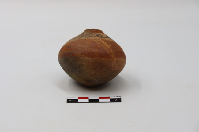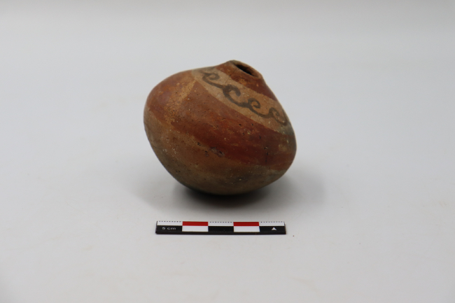 Vasija cerámica con decoración propia de la tradición alfarera San Miguel. Posee un cuerpo elipsoidal horizontal,un cuello troncocónico invertido de bordes directos y base apuntada. En cuanto a su decoración posee bandas anilladas en color rojo, que habilitan un segmento donde se observa el patrón consecutivo de olas esquematizadas en color negro.