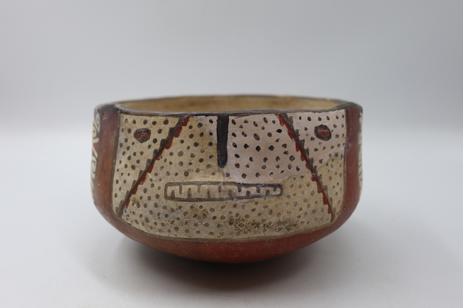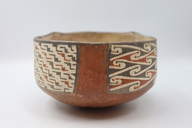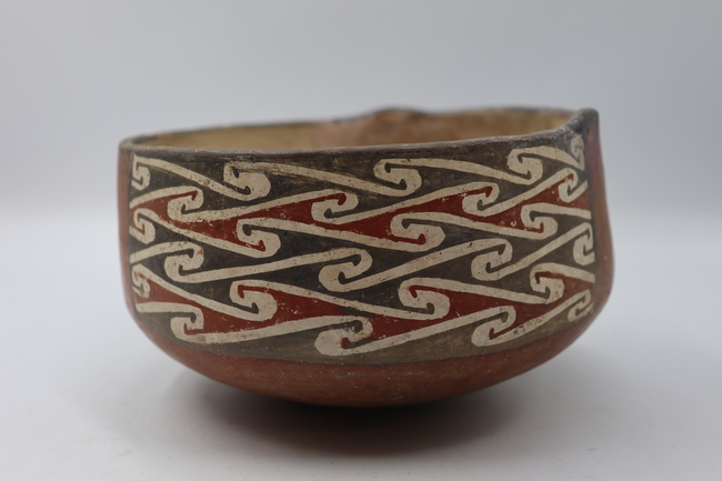 Cuenta con un contorno simple y una base de tipo convexa. En cuanto al diseño, se observa una banda horizontal que cuenta con dos motivos no figurativos principales. Por un lado se observa un patrón de ondas C5, donde la unidad mínima se compone de una figura triangular con terminación de un gancho recto. Los colores rojos y negros se alternan entre cada alineación horizontal de unidades mínimas. En su lado opuesto, se observa un patrón similar a uno de líneas quebradas A 2-1. Se observa una diferencia en cuanto a la alternancia de engrosamiento en el trazo horizontal inferior de las unidades mínimas. No obstante, se mantiene la caracterización de unidades mínimas que se alternan entre colores rojo y negro.