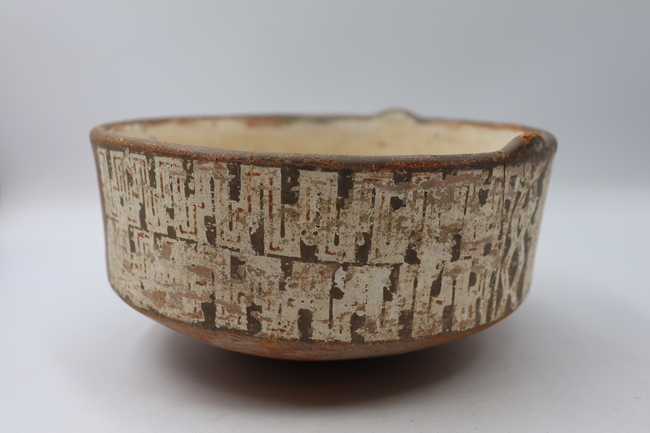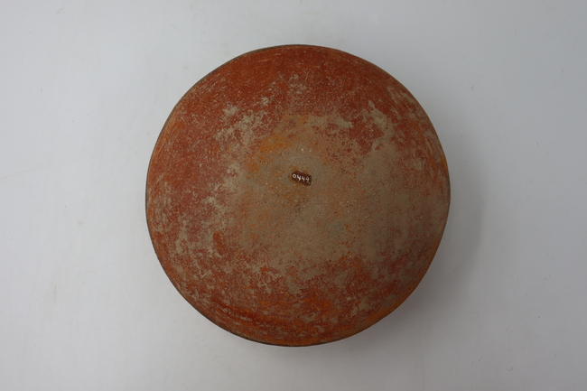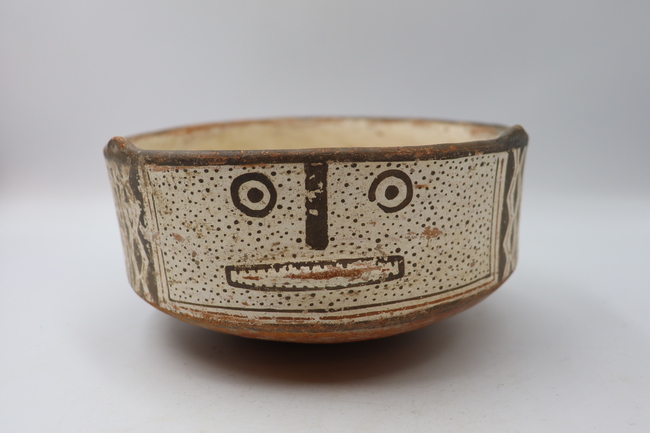 En el centro de la escudilla se observa el diseño de un felino que se le limita dentro de un rectángulo con un ribete que se compone de dos líneas, una exterior roja y una interior negra. El rostro del felino se compone dos círculos huecos con un punto negro en su centro. La boca tiene una forma rectangular que se ensancha levemente en el centro. Presenta dos corridas de dientes representados por pequeños trazos verticales. La nariz se muestra como una línea vertical gruesa que se ubica en medio de los ojos y que se une al labio del contenedor. Por último, la figura presenta un diseño moteado consistente en una serie de puntos que cubren la superficie de forma relativamente regular y que se encuentran circunscritos en el ribete.