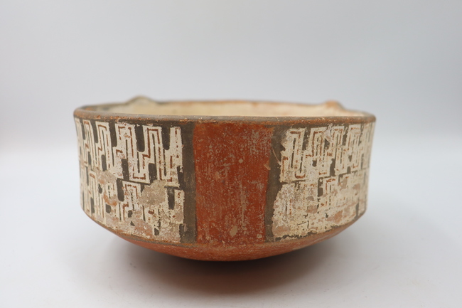 Cuenta con un cuerpo elipsoidal y una base de tipo convexo. En cuanto a su diseño se observa una banda horizontal que presenta un diseño no figurativo identificado como patrón de doble zigzag A2, donde la unidad mínima se compone de una línea vertical engrosada en su inicio que se refleja desplazadamente con la unidad opuesta y se traslada en sentido horizontal. En esta variante, las unidades mínimas se unen por una línea negra horizontal que divide toda la banda. A los costados del diseño central del felino, se observan dos bandas verticales (laterales) que presentan un diseño de rombos negros demarcados por una franja blanca en donde se dibuja una fina linea roja que recorre su centro.