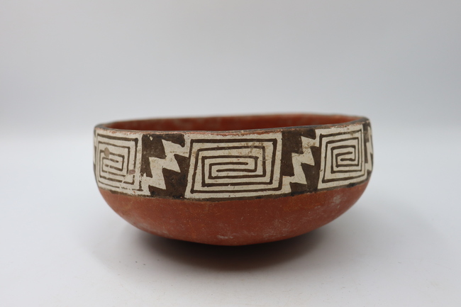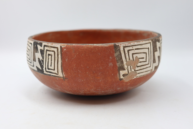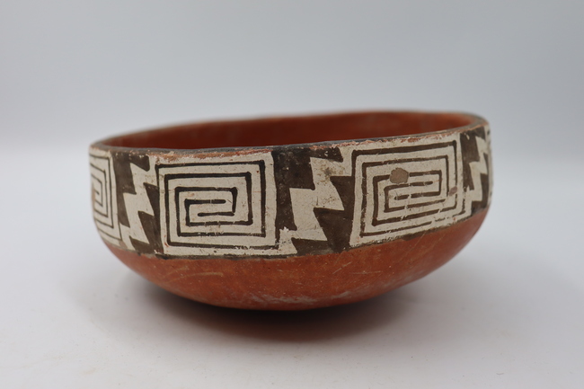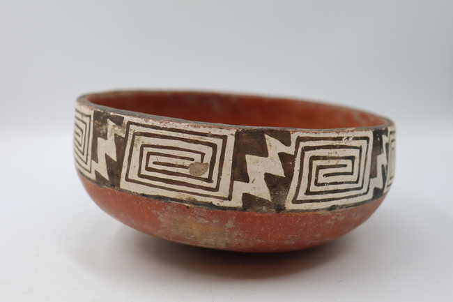 Contenedor cerámico de tipo no restringido correspondiente a una escudilla policroma de fase Diaguita II, estilo clásico. Posee un borde directo y un labio recto. Cuenta con un cuerpo elipsoidal horizontal y una base de tipo convexo.