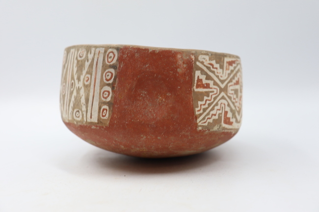 Cuenta con un cuerpo elipsoidal y una base de tipo convexo. En su diseño, se observa una banda horizontal que presenta dos diseños no figurativos a cada lado de la escudilla. Hacia un costado se observa un diseño similar al patrón de doble reflexión especular. No obstante, se observan ciertas diferencias significativas, en donde se destaca la presencia de líneas zigzag gruesas en que se sitúan entre medio de los rombos escalonados y que se alternan en colores rojo y negro. En el lado opuesto se observa un patrón de doble reflexión especular F. La unidad mínima se compone de un motivo triangular negro sobre fondo blanco que presenta un círculo concéntrico de color rojo en su interior. En cuanto a las bandas verticales (laterales) que se sitúan a los costados del diseño central, estas se componen de grecas escalonadas que a la vez cuentan con una línea zigzag escalonada de color rojo sobre blanco en el medio. Este diseño es similar al patrón de zigzag A2, no obstante —naturalmente— se diferencian en ciertos detalles no menores y además el diseño en esta escudilla se dispone de manera totalmente vertical.