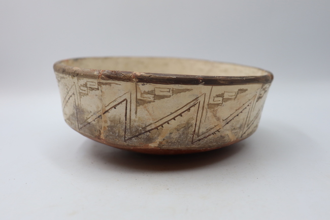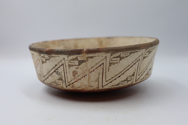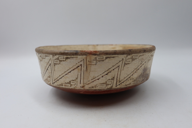 En cuanto a su diseño, se observa una banda horizontal con un patrón muy similar al identificado como zigzag C5, no obstante, el diseño presente en esta escudilla se compone de una greca doble escalonada. Esta se refleja desplazadamente y se traslada a lo largo de la banda horizontal. Al igual que en el patrón zigzag C5, las unidades mínimas son separadas por una doble línea zigzag horizontal con puntos exteriores de colores rojo y negro.
