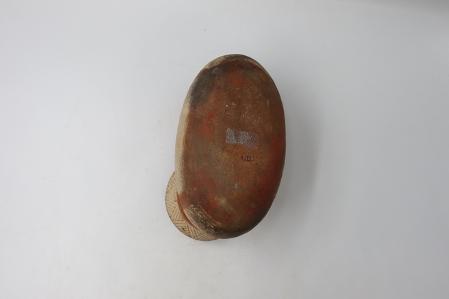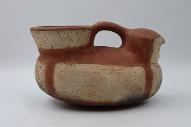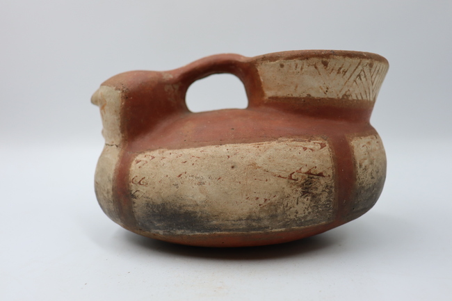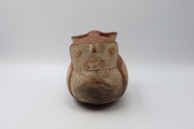 Contenedor cerámico con forma de Jarro-Pato antropomorfo polícromo de fase Diaguita II, estilo clásico. Posee un cuello cónico invertido, un labio redondeado y un borde directo. Cuenta con un cuerpo elipsoidal horizontal y una base de tipo convexo. Entre la cabeza y el cuello se encuentra un asa que une ambas partes.