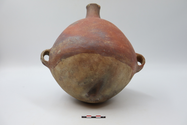Contenedor cerámico adscrito al estilo o fase San Miguel. Cuenta con un cuello hiperboloide de borde evertido, cuerpo ovoide y base apuntada, se observa una adición de asas en cinta en sector medio del cuerpo. En cuanto a su decoración, cuenta con la adición de pintura roja en la parte superior de su cuerpo (75% del cuerpo aproximadamente ), incluyendo sus asas en cinta, sin alcanzar el sector inferior de la pieza.