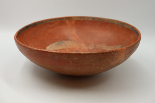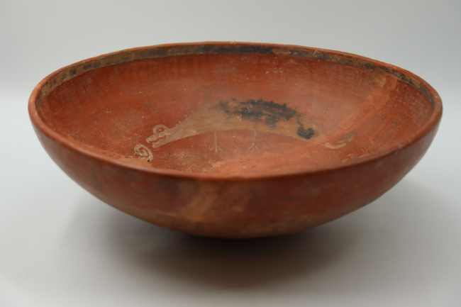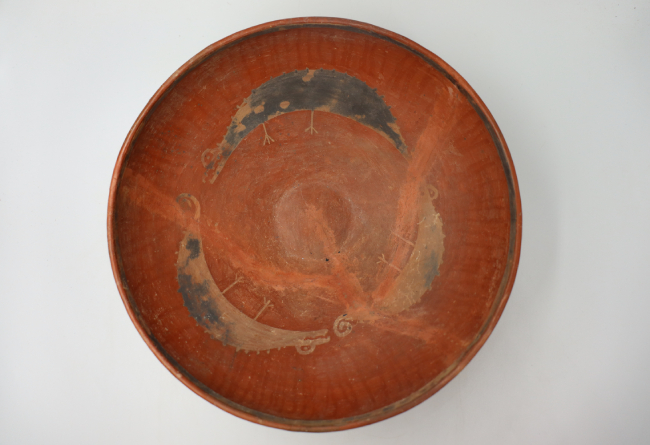 Contenedor cerámico modelado. Su forma general es elipsoidal horizontal, de bordes directos de labio redondeado y base plana. En cuanto a la decoración, la pieza teien un recubrimiento de engobe rojizo y tratamiento de superficie bruñido. Se observa un anillo de pigmento negro sobre el borde extremo interior de la pieza (motivo a), así como la secuencia de tres figuras homólogas reptiloides que giran en torno al punto central interior de la vasija, doblando sus cuerpos en torno a éste (motivo b); también pintadas en negro.