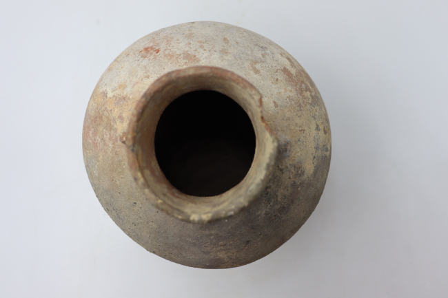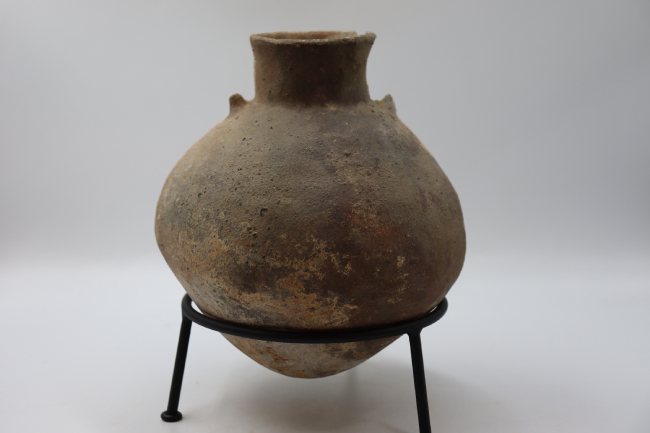 Contenedor cerámico monocromo modelado. Su forma general es ovoide, presneta un cuello hiperboloide formado por bordes evertidos y una base pauntada. Cuenta con la adición de dos protuberos cónicos en la parte superior del cuerpo, cercano a la unión entre el cuello y cuerpo.
