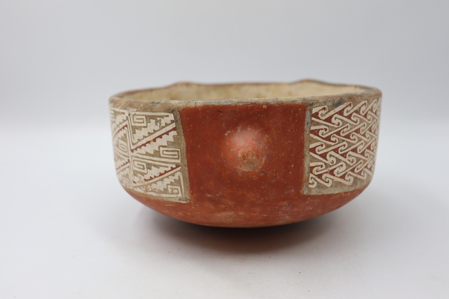 En la parte frontal de la escudilla se observa la figura de un felino que se circunscribe dentro de un rectángulo delimitado por un ribete que se compone de dos líneas paralelas unidas, una exterior roja y una interior negra. Se observan dos círculos huecos con un punto central que representan los ojos. La boca se representa por un rectángulo redondeado con trazos verticales ubicados a ambos polos de este rectángulo. En esta pieza, destaca particularmente la nariz, la cual se representa con un modelado prominente el cual presenta a los costados una continuación del diseño que compone la boca. En unión con el modelado de la nariz, se dibuja un triángulo invertido que se conecta con el labio de la escudilla. La figura presenta un diseño moteado consistente en una serie de puntos que cubren la superficie de forma relativamente regular y que se encuentran circunscritos en el ribete. De manera diametralmente opuesta a la figura frontal, se observa un hiato en el diseño que separa los motivos no figurativos descritos anteriormente, y que presenta un modelado turgente similar al de la nariz a representación de "cola".