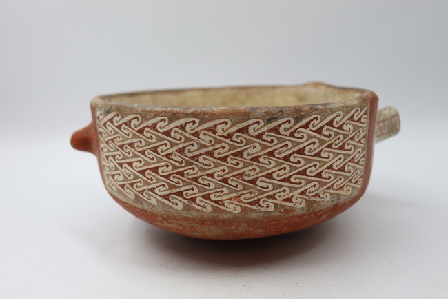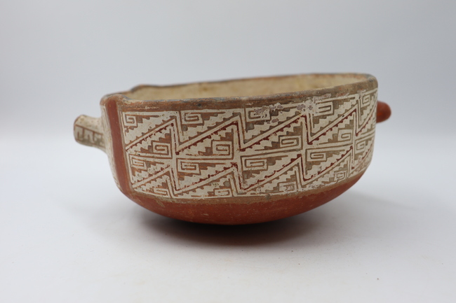 Cuenta con un cuerpo elipsoidal horizontal y una base de tipo convexa. En cuanto a su diseño, se observa una banda horizontal con dos motivos de patrón no figurativo. Por un costado, el patrón observado corresponde a uno de doble zigzag D 1-1, en donde la unidad mínima se compone de una greca escalonada en uno de los sectores laterales y en el sector superior. Estas grecas se reflejan desplazadamente en el sector medio de la banda y luego vuelven a reflejarse desplazadamente en el sector superior e inferior de la misma. En esta variante, se observa una doble línea zigzag horizontal escalonada de color rojo que sigue el contorno de las grecas y que separa las reflexiones. En su lado opuesto, el diseño observado corresponde a un motivo de patrón de ondas C6. La unidad mínima se compone de un diseño con características triangulares y que termina en un gancho. Esta unidad se traslada horizontalmente de izquerda a derecha y luego se refleja desplazadamente respecto a la unidad ubicada en la alineación y inferior. Finalmente, este diseño, como un todo, se traslada verticalmente, desplazándose levemente. En la variante observada en esta escudilla, la unidad mínima presenta terminaciones más largas y cambios de colores entre cada alineación horizontal. Las unidades mínimas alineadas horizontalmente alternan su color de negro a rojo al trasladarse verticalmente respecto a la línea superior.