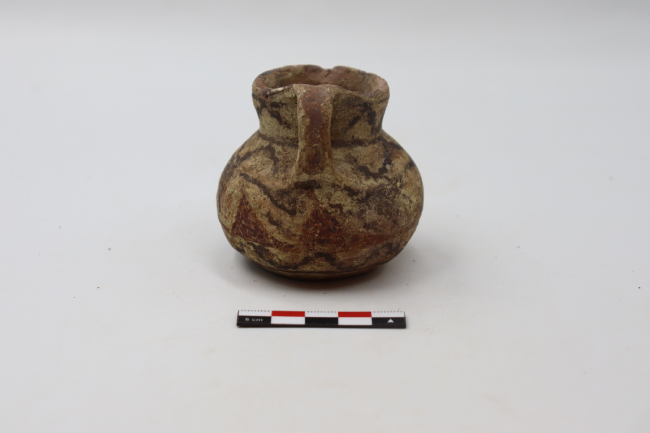 Contenedor cerámico restrigido, modelado y miniatura adcrito al estilo o fase San Miguel. Posee cuello troncocónico invertido, de bordes directos, un cuerpo elipsodal horizontal y una base plana. Posee asa en cinta que sobresale del labio y se une al cuerpo. En cuanto a la decoración, posee la adición de un pigmento crema, sobre la totalidad de la superficie externa del cuerpo. Sobre la que se dibujan, en tonos negros y rojos, un motivo de olas contrapuestas (motivo a) y escalinatas en negro sobre la parte superior del cuerpo, así como también en el diametro del cuello (motivo b).