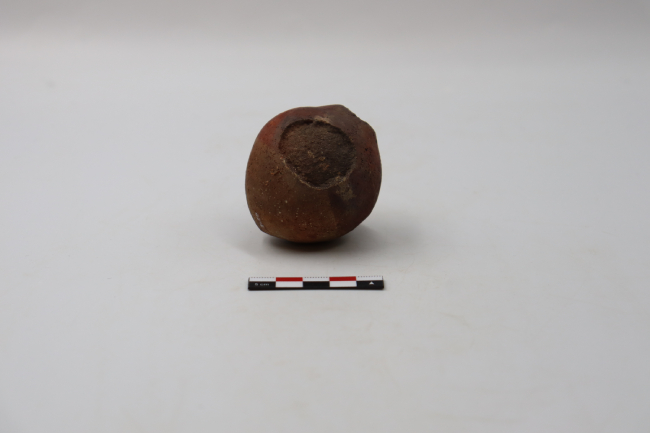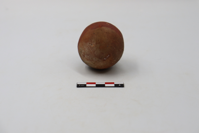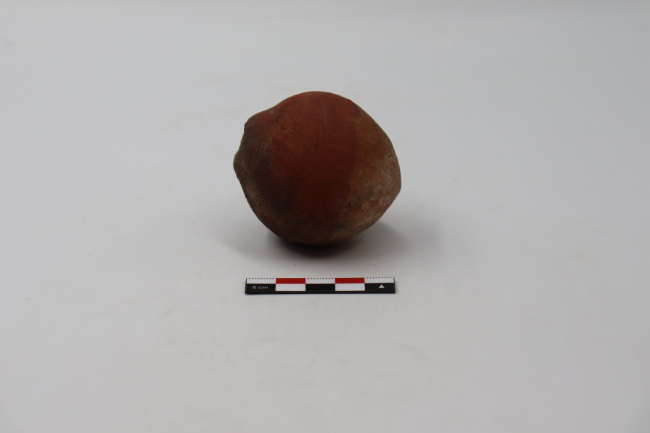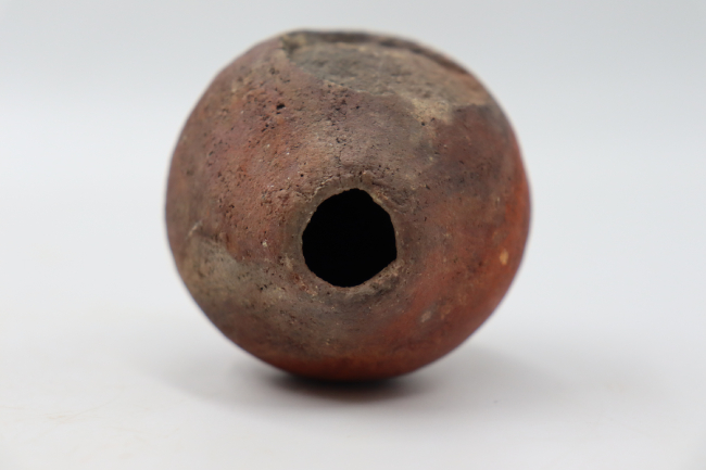 Contenedor cerámico restringido y modelado adscrito al estilo o fase San Miguel. Cuenta con un cuerpo ovoide de base convexa y una pequeña inflexión sobre el borde. En cuanto a la decoración, cuenta con una adición de recubrimiento de pigmento rojizo sobre la superficie superior de su cuerpo, el cual limita con el labio. Tiene una desportilladura circular que expone la pasta.