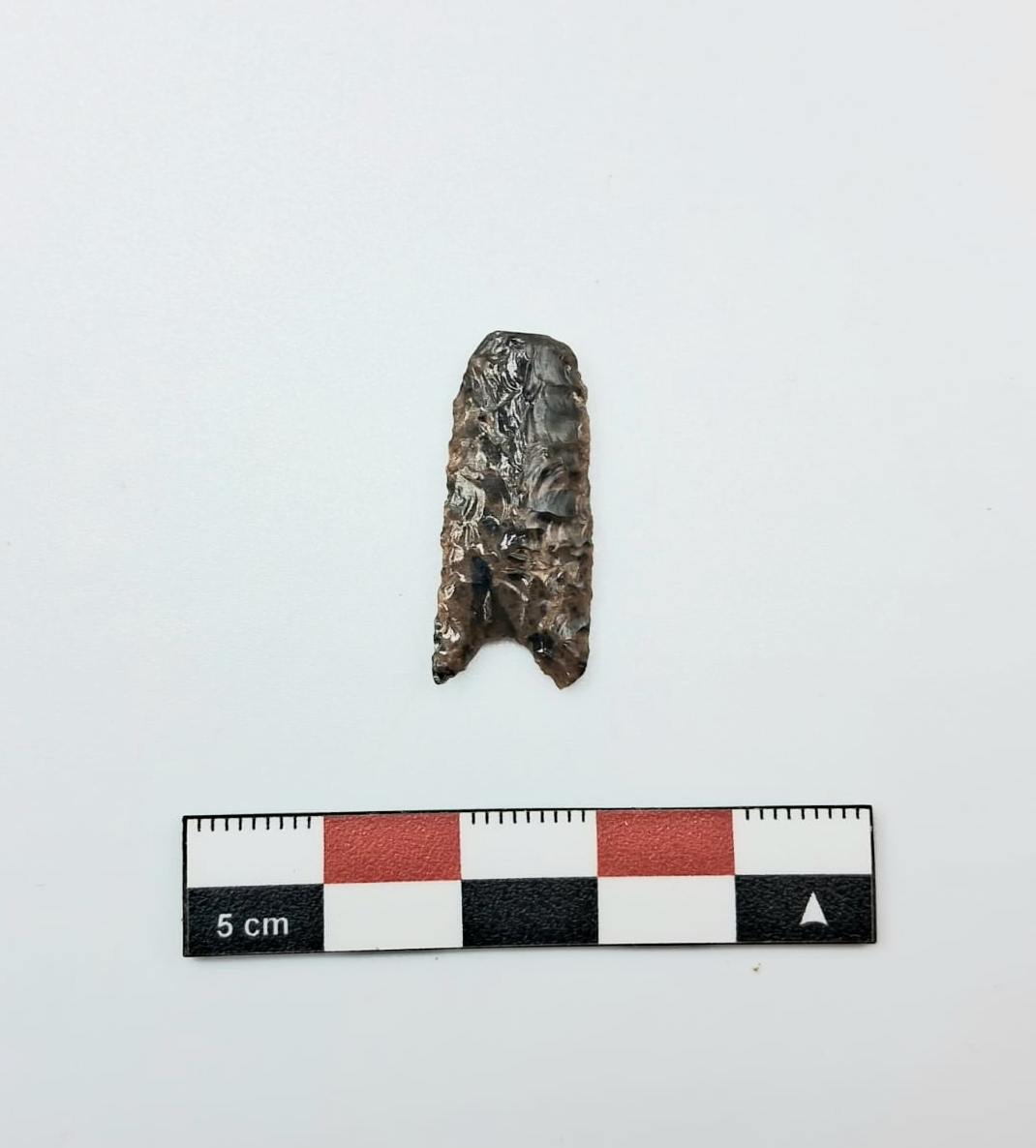 Punta de proyectil se obsidiana de talla bifacial. La forma general no se identifica puesto que falta parte superior del limbo, la base tiene una escotadura pronunciada y dos aletas. La sección es biconvexa. Se identifican lascados en ambas caras y retoques marginales finos y continuos realizados con una herramienta de presión.