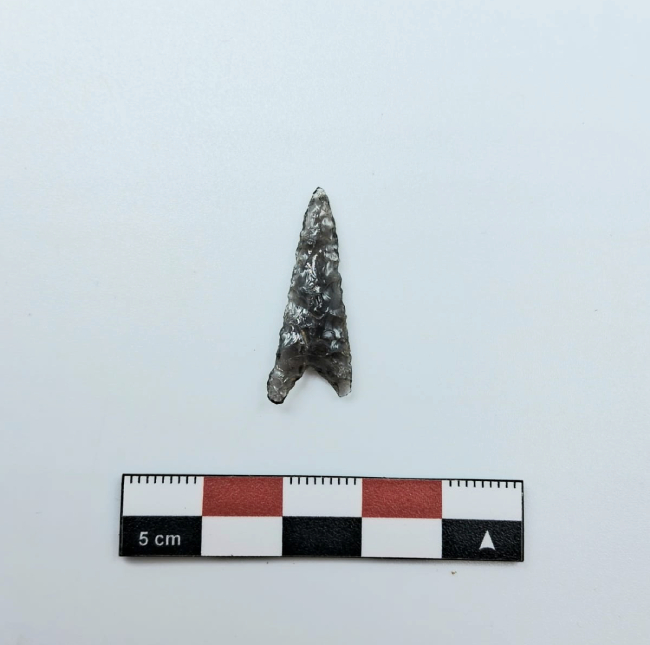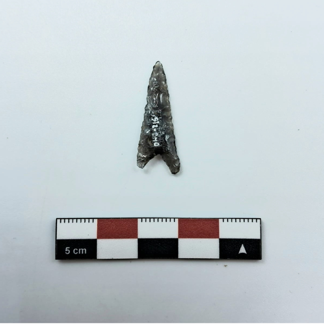 Punta de proyectil de obsidiana elaborada mediante talla bifacial. Presenta una forma general triangular, con bordes rectilíneos, base escotada y aletas laterales asimétricas de contorno redondeado. La sección es biconvexa. En ambas caras se observan negativos de lascado, así como retoques marginales finos, continuos y regulares, probablemente realizados mediante presión.