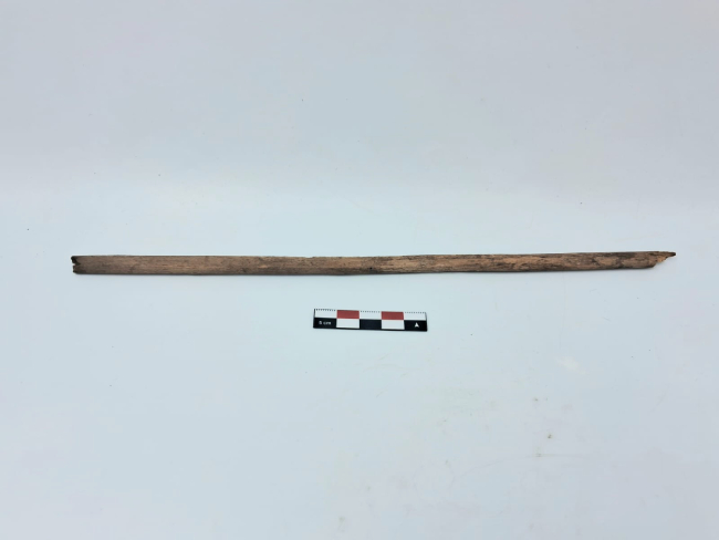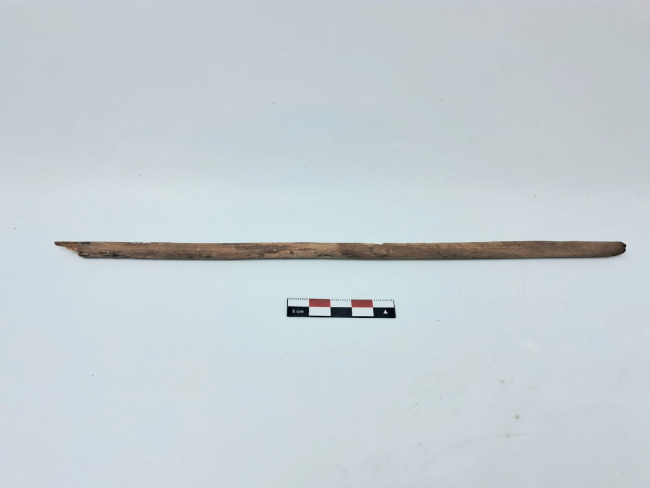 Varilla de madera liviana y hueca. Presenta fracturas en ambos extremos que dificultan su lectura. Se estima que corresponde a un vástago de proyectil disociado.