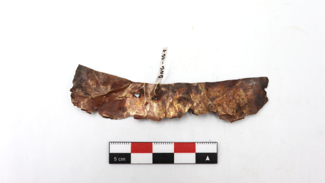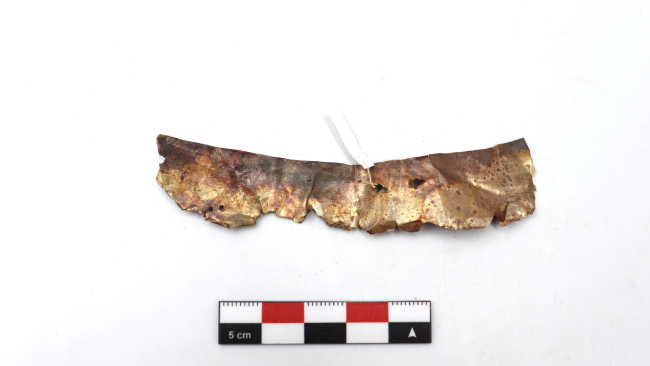Fragmento de lámina de metal, trabajada mediante martillado, correspondiente a una pieza originalmente de morfología rectangular alargada, actualmente incompleta y con pérdida significativa de material. El fragmento presenta bordes irregulares, dentados y con desgarros, evidenciando fracturas antiguas y procesos de deterioro postdepositacional. La superficie muestra marcadas huellas de laminado, junto con perforaciones irregulares y microorificios, algunos atribuibles a punzonado original y otros posiblemente a corrosión localizada.