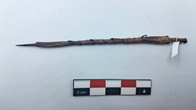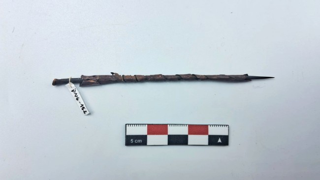 Espina de cactus envuelta en 11 vueltas de una lámina de metal plano. El metal fue identificado como una aleación de oro con cobre, la cual fue laminada.