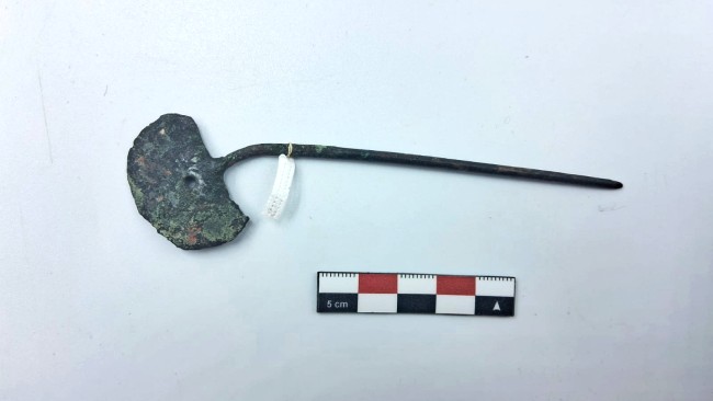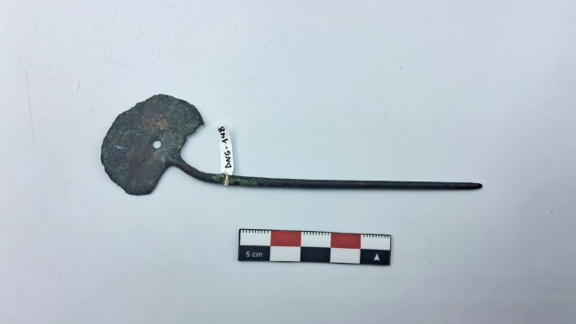 Tupu de metal formado por una placa laminar en forma de medialuna y un alfiler que compone la mayor parte de la pieza a nivel longitudinal. La decoración consiste en un calado circular en la parte inferior de la placa, cerca del punto de unión entre esta y el alfiler. El calado tiene 0.2 cm de diámetro. El alfiler es de sección circular y punta redondeada. La placa está inclinada hacia un lado.