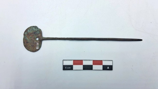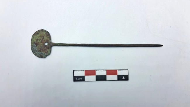 Tupu de metal formado por una placa laminar en forma de medialuna y un alfiler que compone la mayor parte de la pieza a nivel longitudinal. La decoración consiste en un calado circular en la parte inferior de la placa, cerca del punto de unión entre esta y el alfiler. El calado tiene 0.2 cm de diámetro. El alfiler es de sección circular y punta redondeada