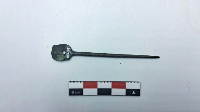 Tupu de metal formado por una placa laminar de forma irregular y un alfiler que compone la mayor parte de la pieza a nivel longitudinal. La decoración consiste en un calado circular en la parte inferior de la placa, cerca del punto de unión entre esta y el alfiler. El calado tiene 0.2 cm de diámetro. El alfiler es de sección circular y punta redondeada. Las pérdidas de la placa son motivo de la corrosión del metal.