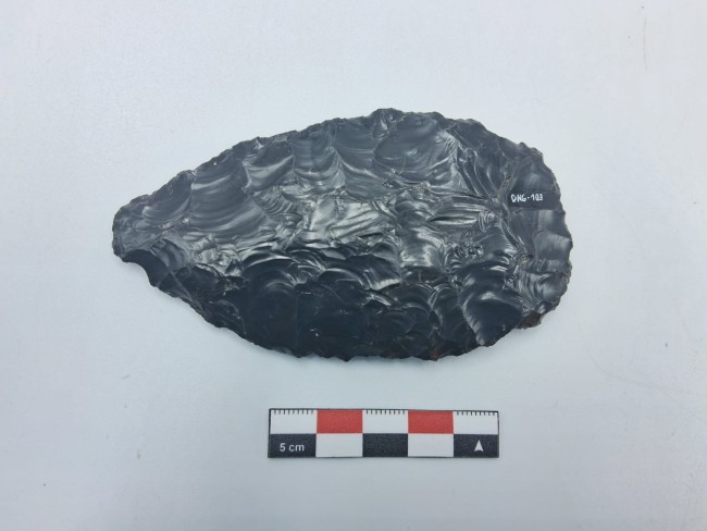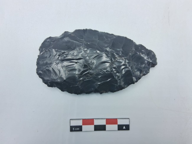 Artefacto lítico bifacial elaborado en obsidiana. Presenta talla bifacial completa, con extracciones amplias y bien controladas en ambas caras, generando una morfología delgada y simétrica.El soporte muestra una forma lanceolada, con eje longitudinal bien definido. Los bordes son continuos y regularizados, configurados mediante retoques bifaciales marginales, agudos y funcionales. El extremo distal se encuentra apuntado, mientras que el extremo proximal es ligeramente más ancho y redondeado.