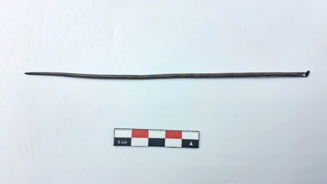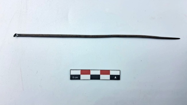 Artefacto de metal utilizado para sostener prendas de vestir. Su forma general es tubular alargada, su sección circular y la punta redondeada. En el extremo distal presenta un orificio circular y una terminación plana.