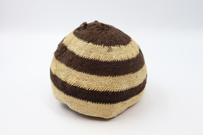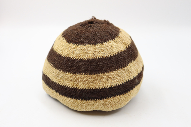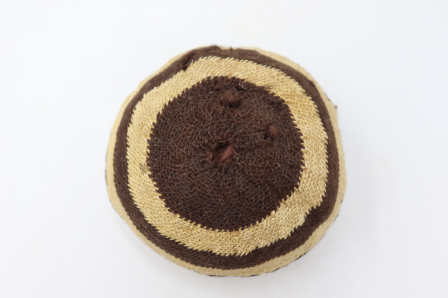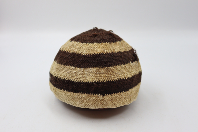 Adorno de cabeza de forma hemisférica. La técnica construtiva de esta pieza es anillado simple en espiral lo que le da la forma semiesférica. La parte superior de la pieza es convexa, los bordes directos y el borde inferior plano. La decoración consiste en bandas café oscuro y beige intercaladas. La torción de la fibra está en Z.
